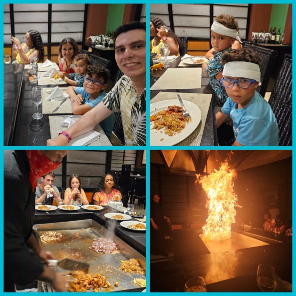 Demoramos cerca de 20 minutos para chegarmos no restaurante japonês e cerca de 1h para voltarmos… aqui foi complicado, pois não passava os carrinhos de jeito nenhum pois já era próximo das 00hs. Imaginem como foi caótico o retorno com 2 crianças cansadas… O pior é que você fica isolado, não há telefone ou nenhum meio de se comunicar com ninguem do hotel. Simplesmente você fica sentado no ponto do “ônibus”, esperando, esperando, esperando… O bom é que o chef foi incrível, brincou com as crianças, fez uma festa danada para preparar a refeição e assim ajudou a tornar menos complexo a ida e volta do restaurante.